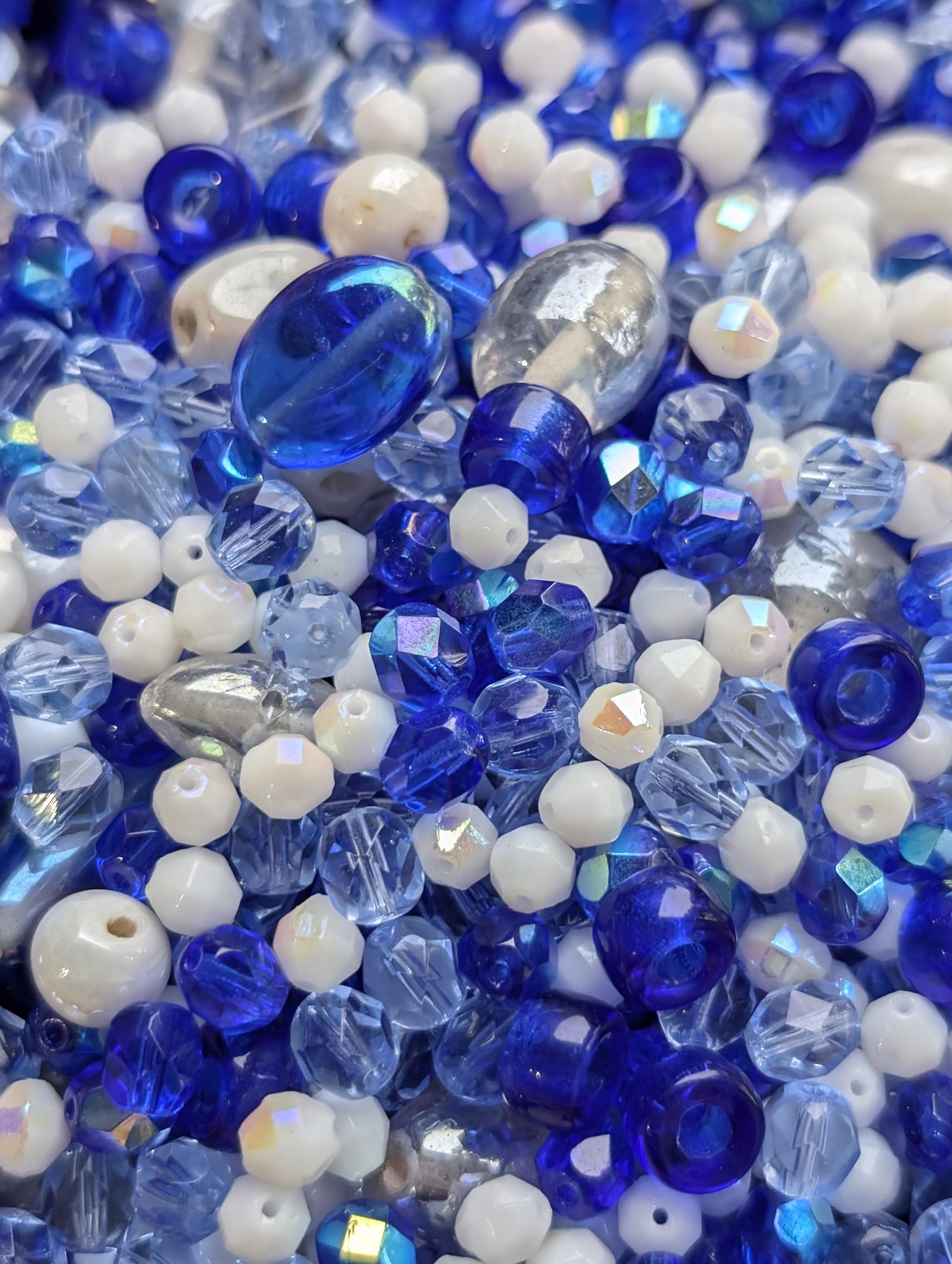 Plunge into the depths of the "Icy Moonlight" with this exclusive bead mix! This blend features a beautiful spectrum of blue and white glass beads, offering rich textures and tones for your next jewelry project.