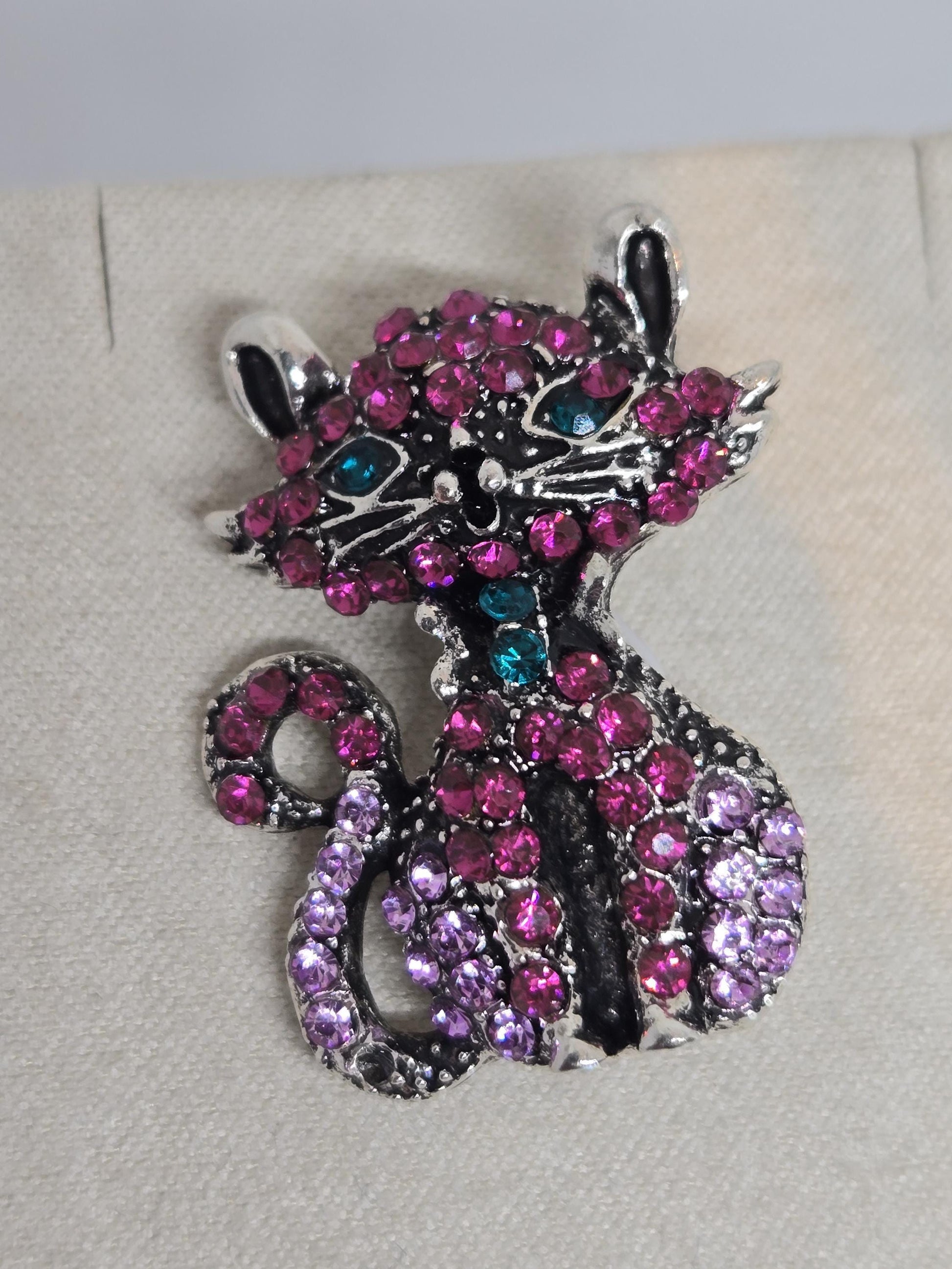The fuchsia kitty brooch is a sparkling rhinestone brooch designed to add playful charm and color to any outfit. This colorful jewelry accessory features a whimsical cat pin design that delights cat lovers and fashion enthusiasts alike. Crafted with vibrant rhinestones, this sparkly animal brooch offers a unique brooch gift option that combines style with personality. Whether worn as a decorative lapel pin or transformed into a pendant, the fuchsia kitty brooch enhances your look with its cute cat jewelry appeal.
