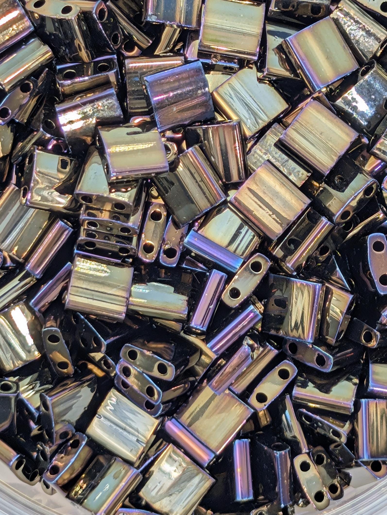 Explore the endless possibilities offered by these premium flat tile beads for crafts and transform your designs with the sophisticated charm of Miyuki Tila beads in Dark Olive with Metallic Rainbow finish.