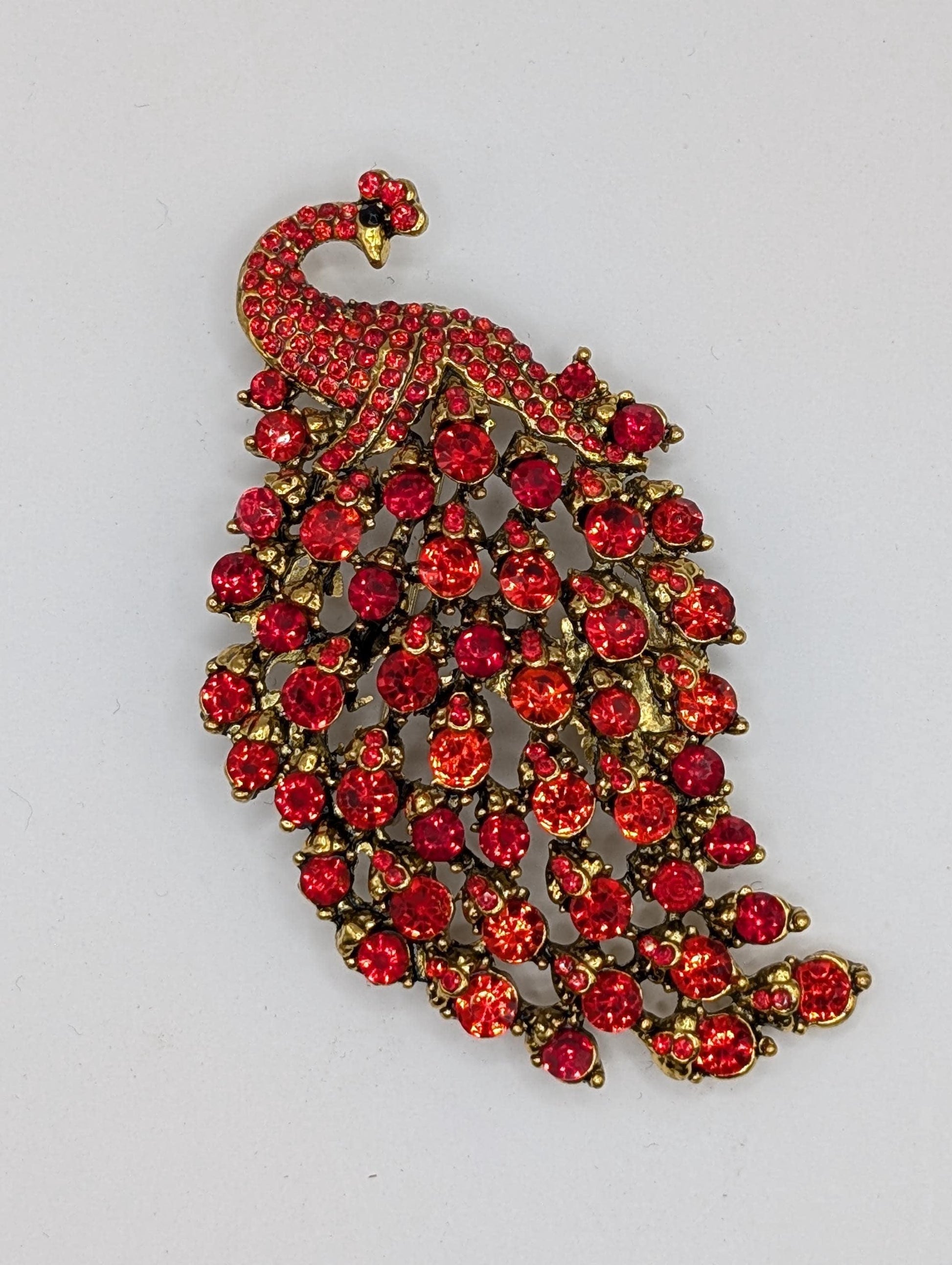Peacock Brooch - Gold Plated Rhinestone Pin with Red Feathers, Statement Jewelry Piece