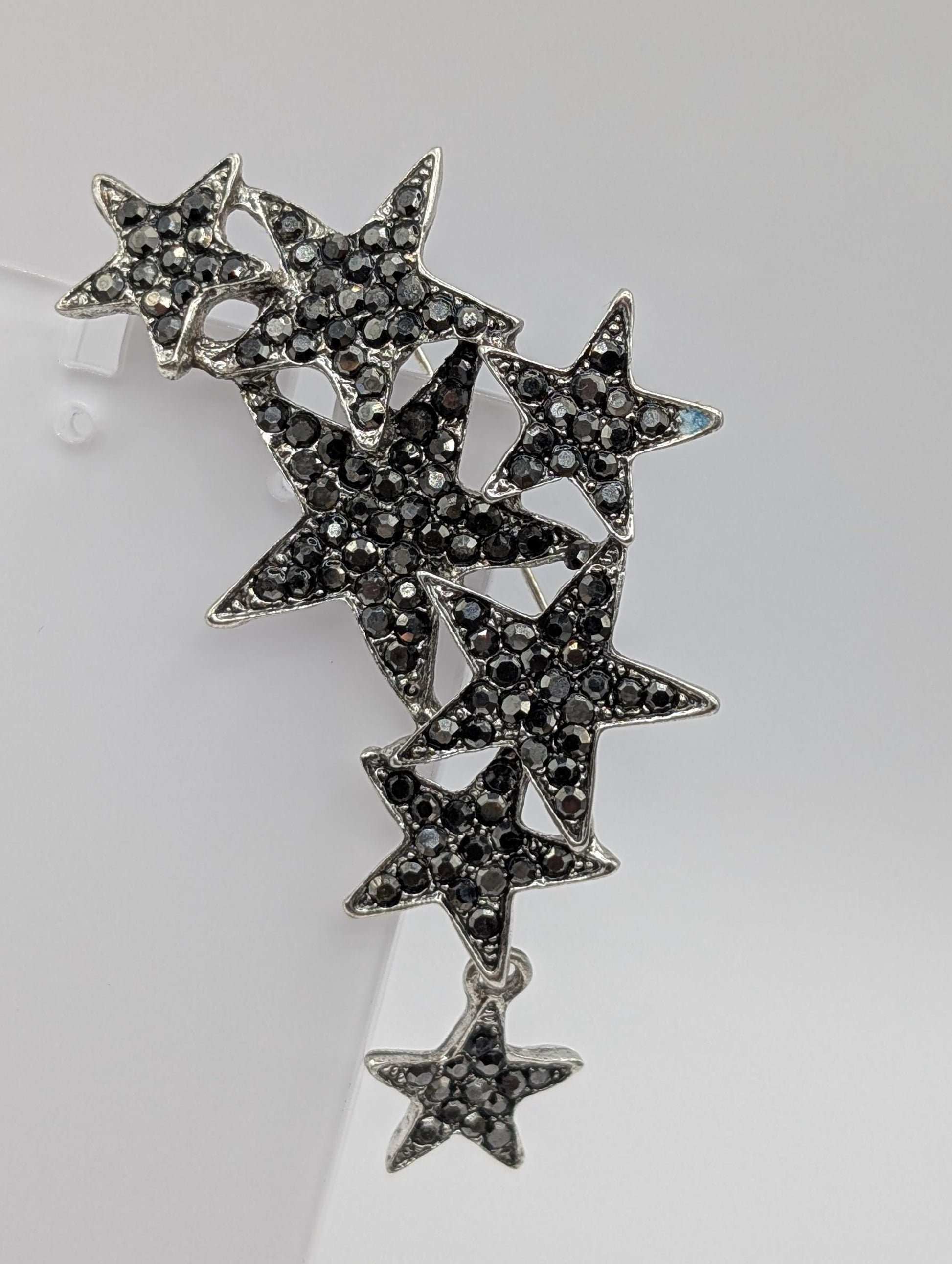 This silver plated brooch offers a stunning blend of elegance and whimsy, designed to elevate any outfit with its celestial charm. The silver plated brooch features gunmetal tone accents and sparkling gray crystals that create a cosmic shimmer, making it a standout starry night brooch for those who appreciate unique celestial jewelry accessories. Measuring 70x35mm, this multistar decorative pin is the ideal size to adorn jackets, scarves, or bags, delivering lightweight brooch design and comfortable all-day wear.