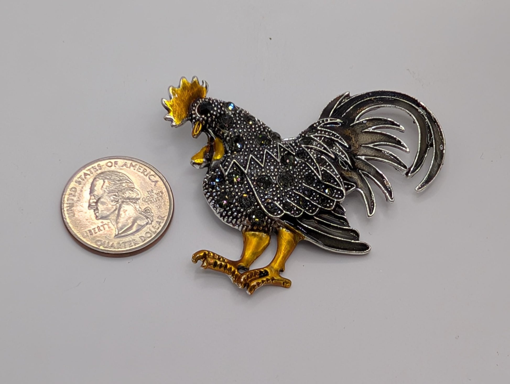 - Silver plated rooster brooch with sparkling rhinestone details → adds eye-catching flair to any outfit