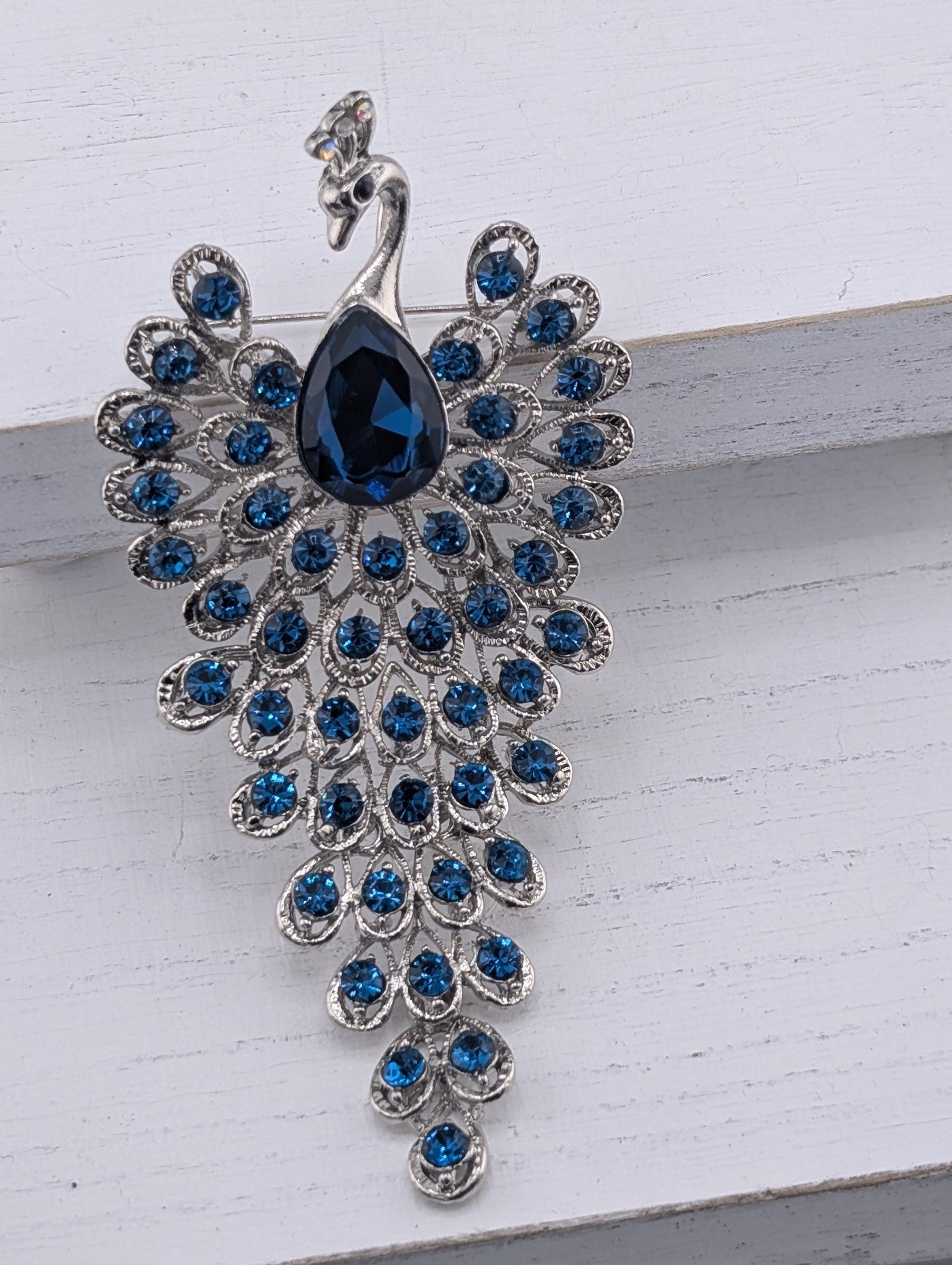 The teal peacock brooch is a stunning silver tone brooch designed to add elegance and color to your wardrobe. This unique decorative pin features vibrant blue rhinestone jewelry that captures the essence of a peacock feather brooch, delivering a charming animal brooch perfect for those who appreciate whimsical jewelry accessories. Measuring approximately 2.5 inches wide, this sparkling fashion brooch combines style and quality to create an elegant statement pin that enhances any outfit.